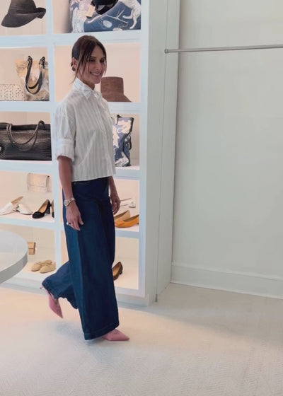 Wide-leg jean in cotton-linen denim. The Dillon Jean is designed with a high-rise waist and a long, straight leg that falls effortlessly to the floor. Finished with a clean back, front pockets, and a classic zip fly.