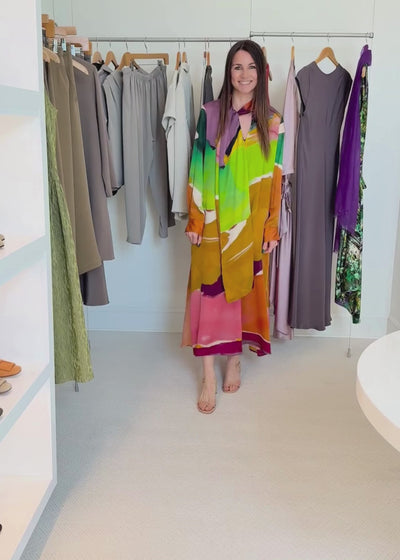 The Critique Dress is an elegant, relaxed silhouette with vividly swirled color fields from Helen Frankenthaler’s 1973 painting, "Nature Abhors a Vacuum." Crafted from silk with a luminous satin finish, this multicolored dress is finished with a scarf neck and waist tie for a fluid yet layered effect.