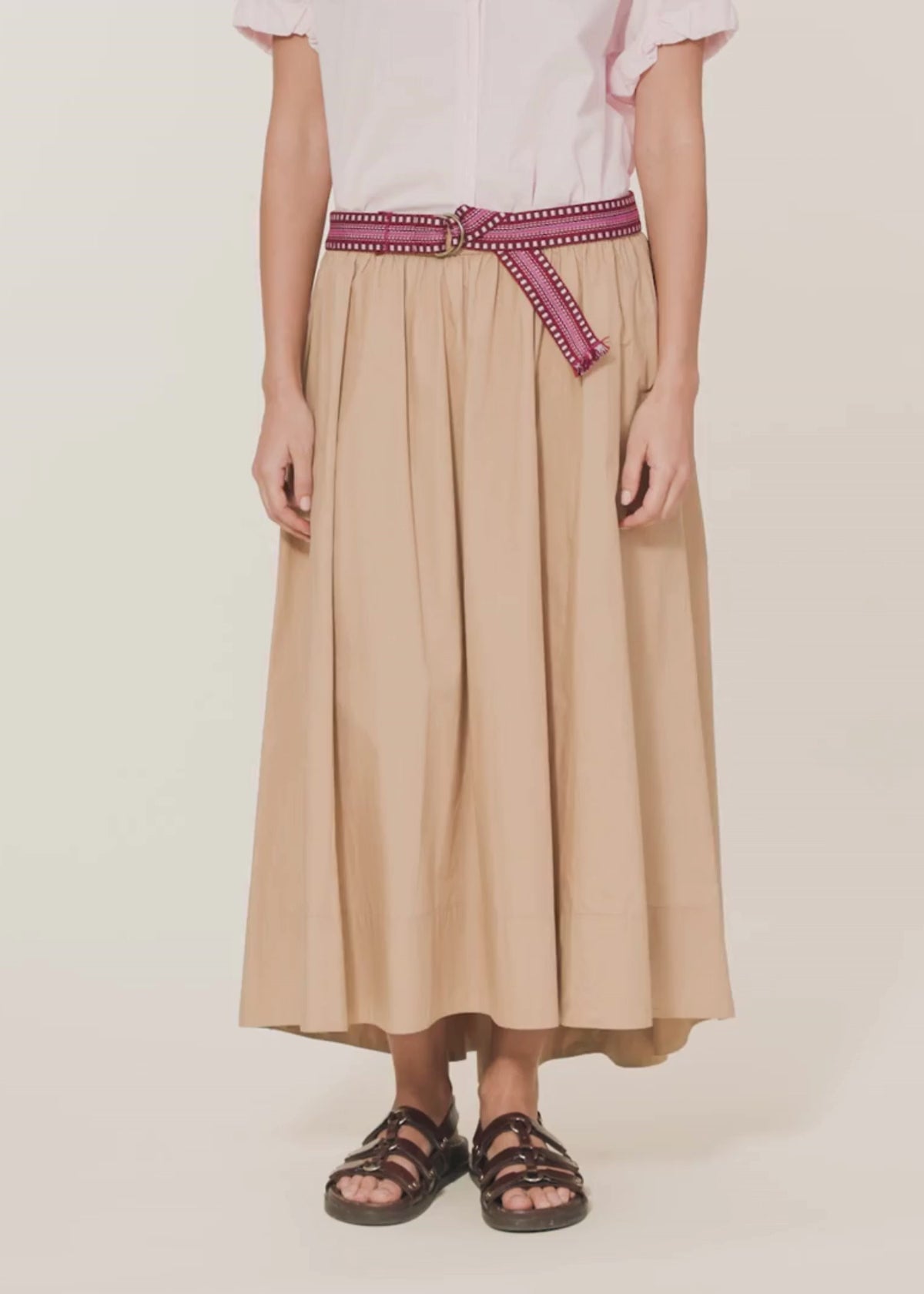 Sitting Pretty. Gwynn is back this season in our crisp paper poplin with a refined feel. This pleated pull-on skirt features an elasticized waist, side seam pockets, and a high-low hem.