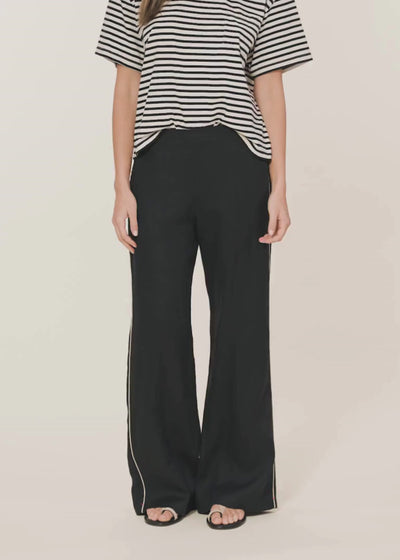 Vacation Mode. Pippen is updated this season in our new lightweight linen. This wide leg pant has an elasticized waist, side seam pockets, and contrast piping.